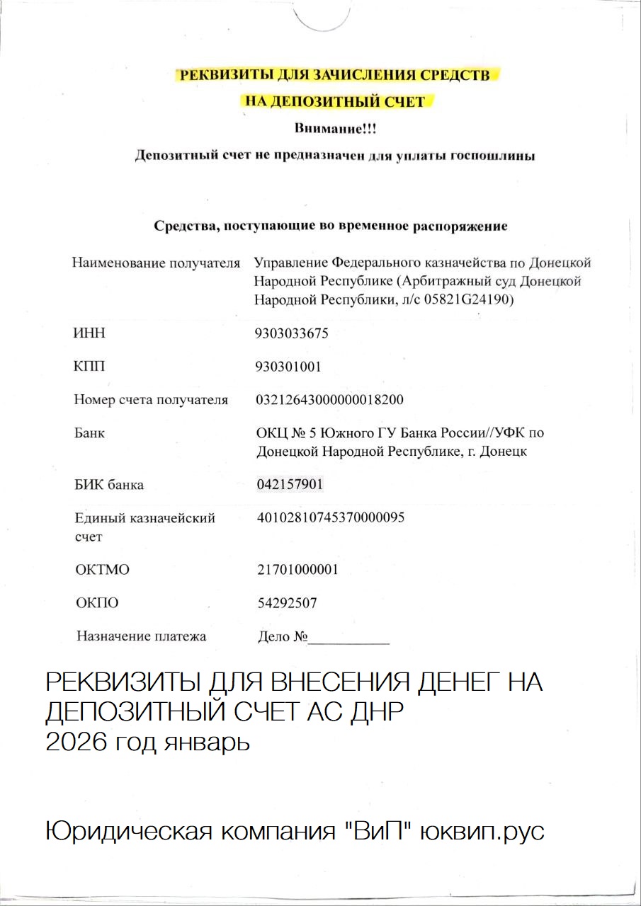 Актуальные реквизиты январь 2026 года, для оплаты государственной пошлины в арбитражный суд ДНР, для внесения денежных средств на депозит арбитражного суда ДНР, для уплаты по решению арбитражного суда ДНР.